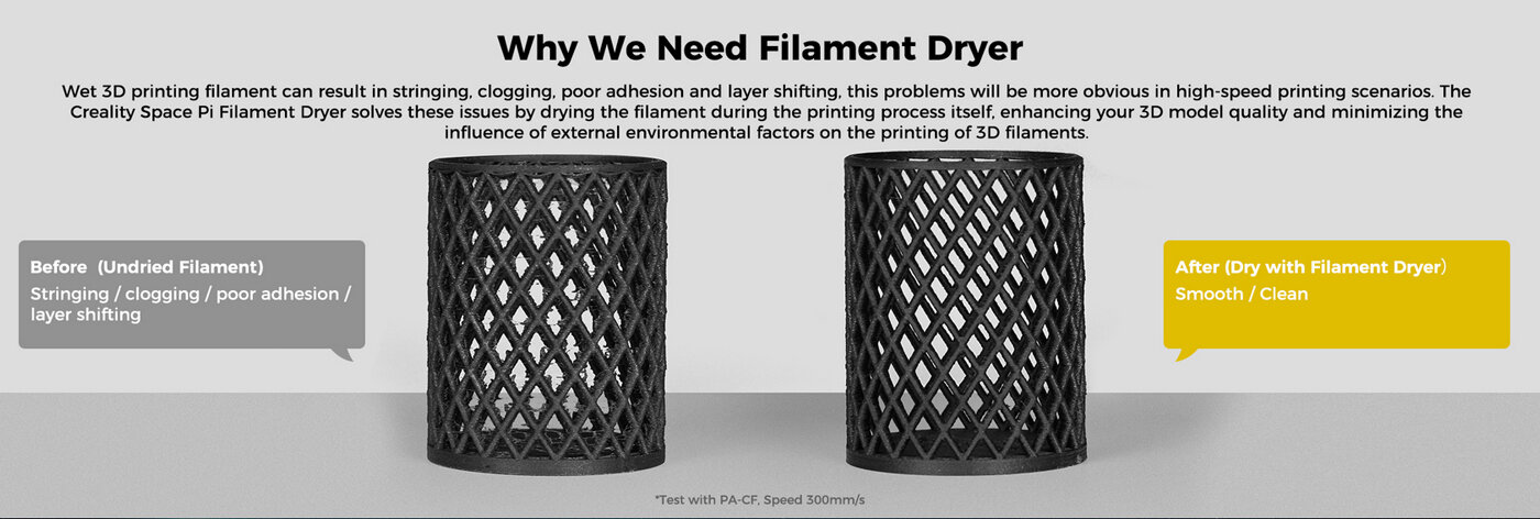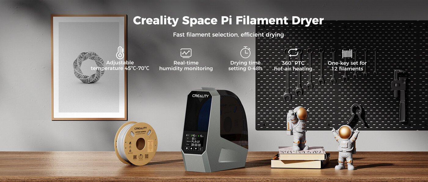 - Влажните нишки за 3D печат могат да доведат до запушване на нишките, лошо сцепление и разместване на слоевете, като тези проблеми са по-очевидни при сценариите за високоскоростен печат. Сушилнята за филаменти Creality Space π решава тези проблеми, като изсушава филамента по време на самия процес на печат, подобрявайки качеството на вашия 3D модел и свеждайки до минимум влиянието на външните фактори на околната среда.