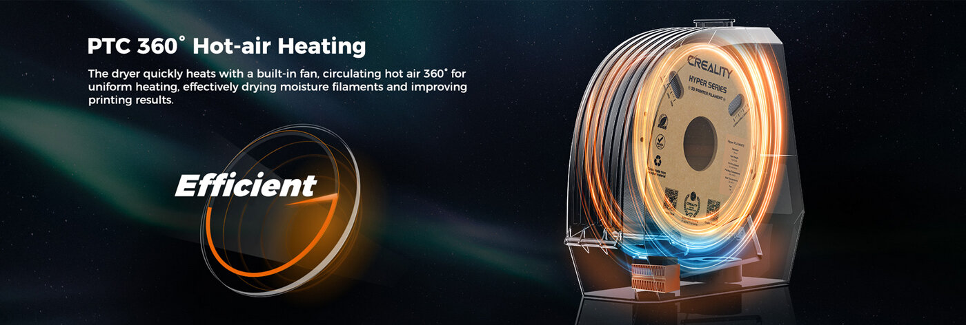 - Сушилнята за филаменти Creality Space Pi се нагрява бързо с вграден вентилатор, който циркулира горещ въздух на 360° за равномерно нагряване, ефективно изсушава влажните филаменти и подобрява резултатите от печата. Нашият сушилник за филаменти за 3D принтери Creality Space Pi използва уникален 110W PTC нагревател за затопляне на пространството, за разлика от повечето сушилни за филаменти, които използват PI нагревател и често водят до неравномерно сушене, нашият модел с PTC нагревател осигурява равномерно сушене. Този PTC нагревател е не само издръжлив и енергоспестяващ, но и екологичен.