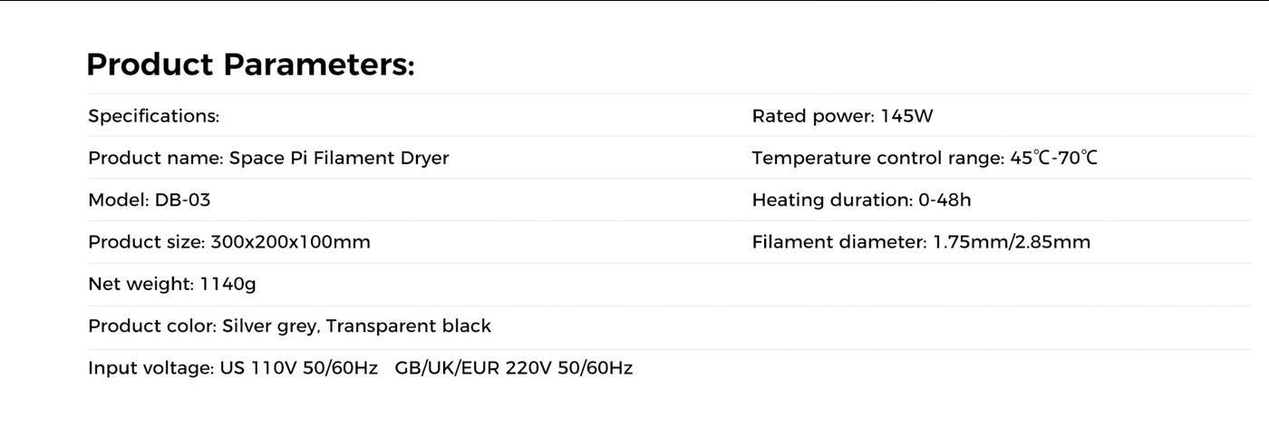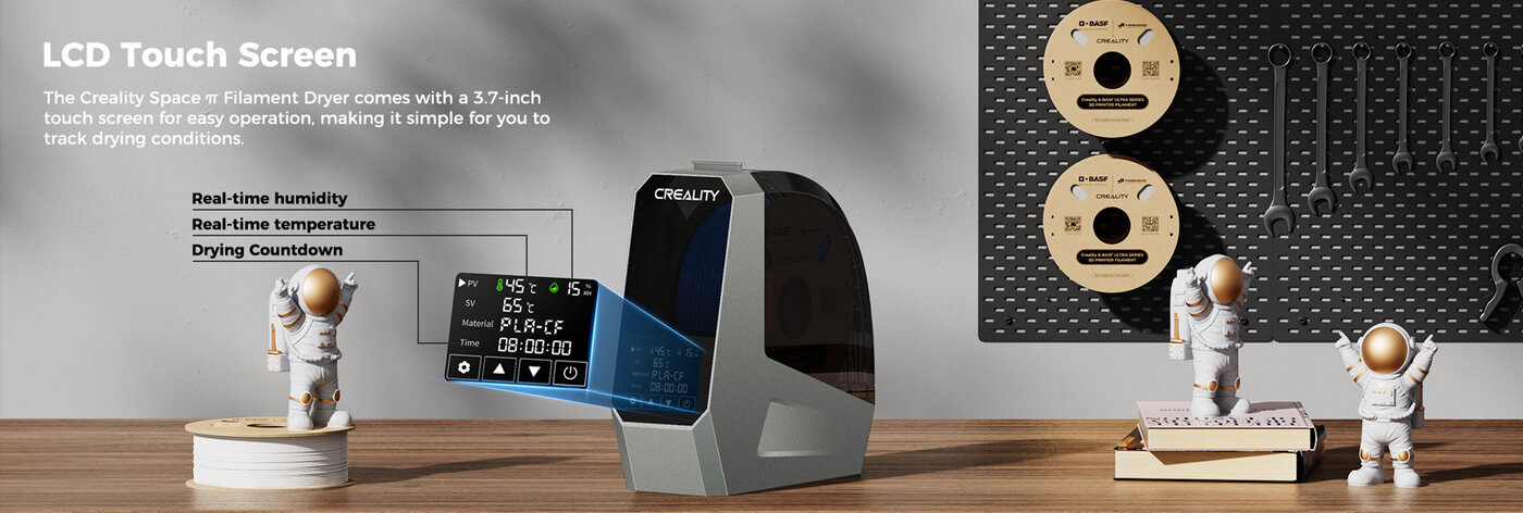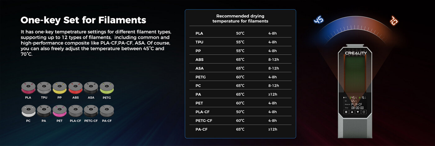 - Сушилнята за филаменти Creality Space Pi има настройки на температурата с един клавиш за различни видове филаменти, като поддържа до 12 вида филаменти, включително обикновени и високоефективни композитни като PLA, ABS, PETG, TPU, PP, PA, PC, ASA, PET, PLA-CF, PETG-CF, PA-CF. Разбира се, можете също така свободно да регулирате температурата между 45°C и 70°C. Сушилнята за филаменти Creality Space Pi е снабдена с 3,7-инчов сензорен екран за лесна работа, което ви улеснява в проследяването на условията на сушене, Сензорният екран също така позволява на потребителя лесно да превключва между ℃ и ℉.